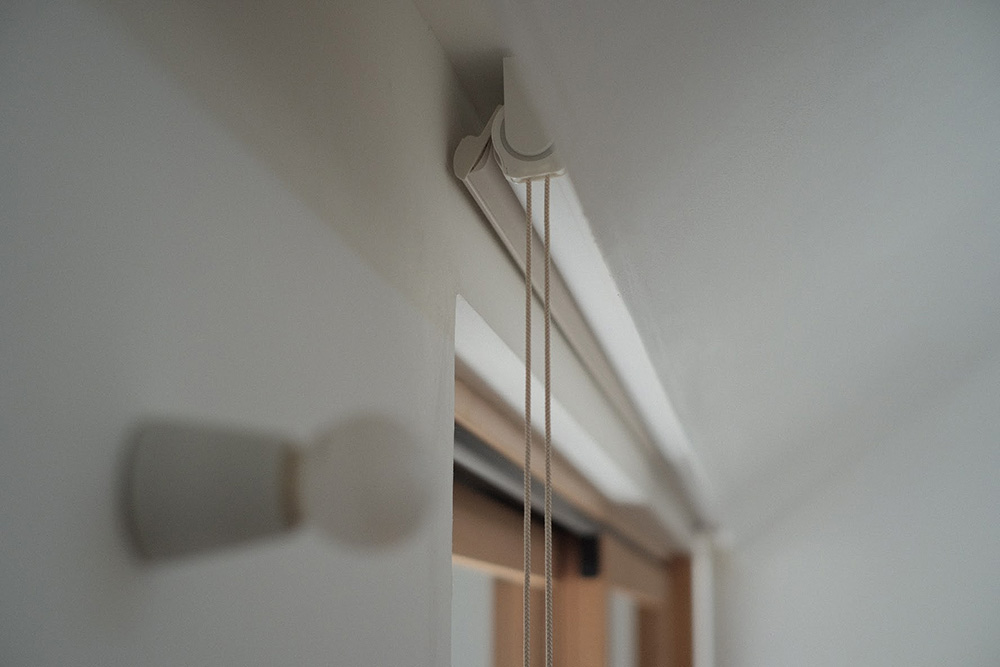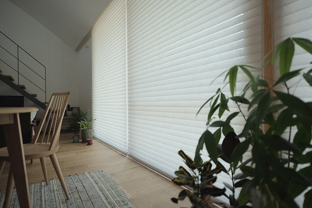 hanariは、2枚のレース記事の間にスラットと呼ばれる調光用の生地がサンドされている構造なので、全部閉めた状態でもある程度光は透過し、暗くならず全体的に軽やかな印象になります。ちなみに、「シェルベージュ」という色(温かみのある白という感じ)を選んだんですが、漆喰の壁との相性が抜群でした。