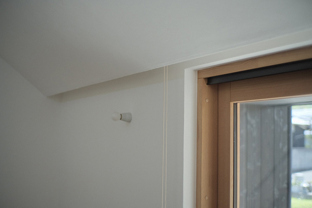 せっかく横開き製品の“たまり”を回避したのに、結局天井部分に巻き取られたロールスクリーンが丸見えでは勿体ないので、R付勾配天井の始まり部分をオフセット加工してもらい、巻き取り部分が隠れるようにしました。全開にしたときに余計なものが目に入らないので、より大窓の解放感を楽しむことができます。