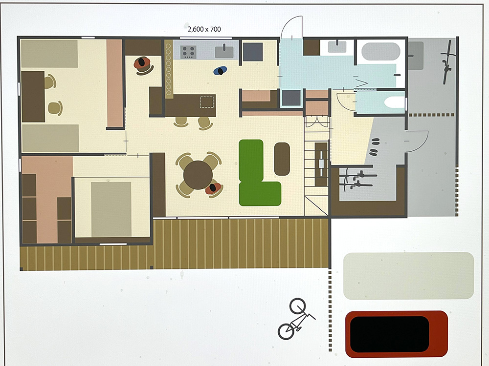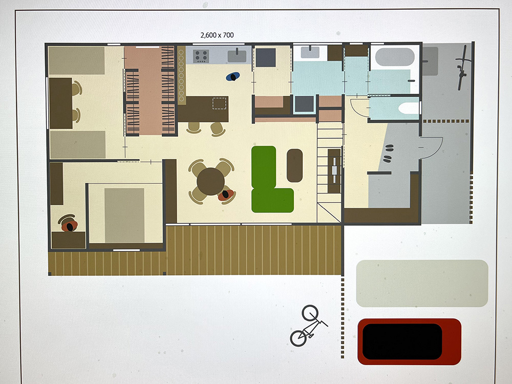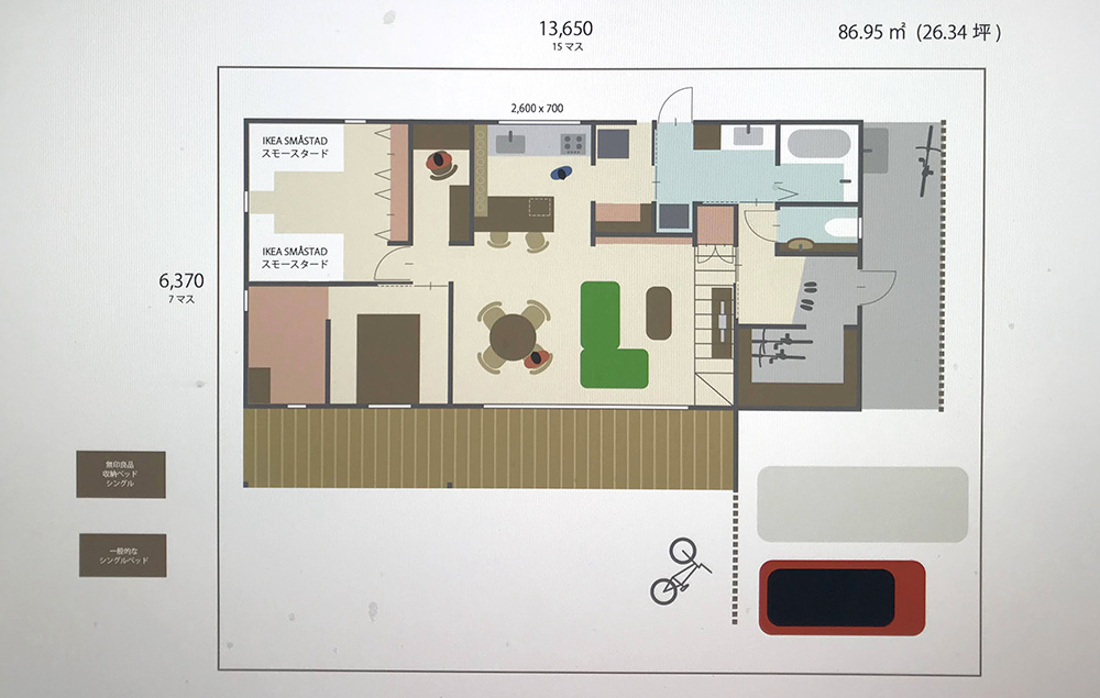 使っている家具や、欲しい家具、設備、自転車など、正確なサイズを調べて配置し、さらに人間も正しい縮尺で配置してみて無理がないかなどを見ていきます。