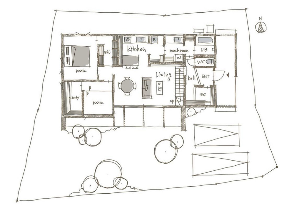 自分の場合は、自分の理想がどういう家かを突き詰めて考え、確固たるビジョンができあがっていたので全部自分で考えました。この方法はどの設計士さんも受け入れてくれるとは限りませんが、自分が頼んだ設計士さんは元々知り合いで仲が良かったこともあり、ほぼほぼ自分が描いた通りの間取りになりました。とはいえ、柱の位置や屋根の形状など、建物としてしっかりしたものになるようアドバイスをもらいながら最終的な図面へと仕上げていきました。