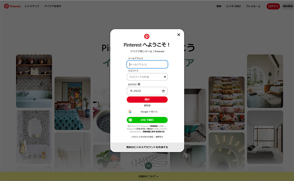 なにはともあれ、Pinterestのサイトにアクセスし、アカウントを作成しましょう。