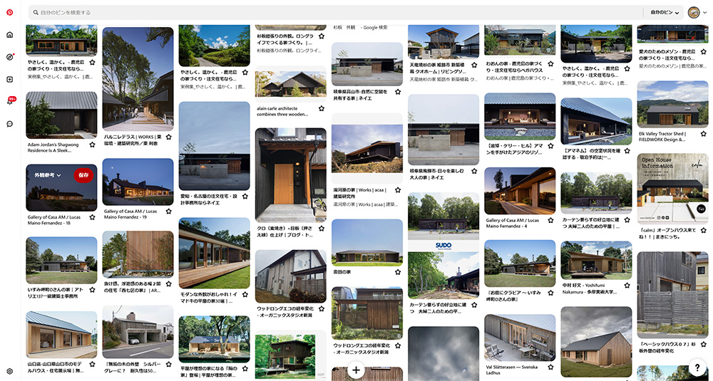 こちらは自分が家の外観をどんな風にするかを考えるために作った「外観参考」というボードです。集め始めて間もない時なので、色も形も素材も、バラついています。