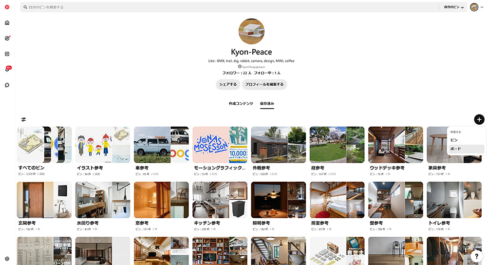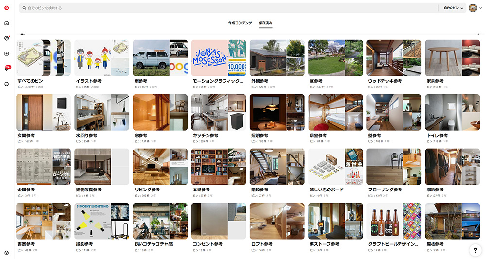 自分のアカウントを改めて見てみると30種類以上のボードに3,000以上のピンがあることが分かりました。ここで重要なのが、そのピンは全て自分の意志によるものだということ。
