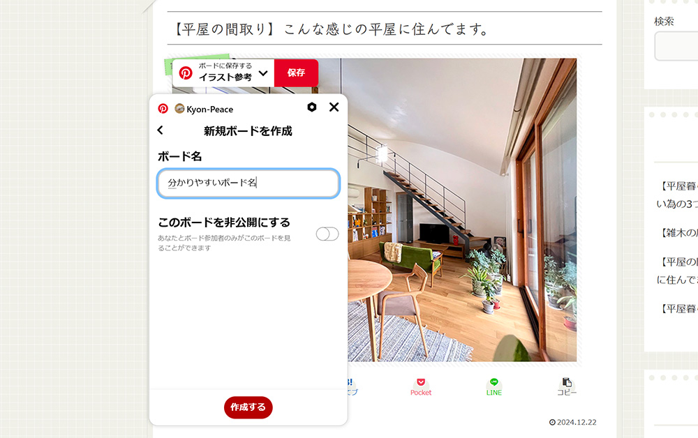 ただ、いちいち画像のリンクを取得してPinterestに入り「ピンを作成」とやっていると面倒くさくなりピンしなくなってしまうので、使用中のブラウザに「Pinterest 保存拡張機能」を追加することをお勧めします。