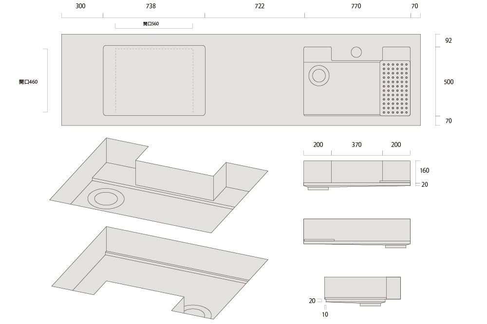 パッと見だと業務用を彷彿とさせるカクッとした形状ですが、それぞれの角には小さなRをつけています。見た目が美しくなるだけでなく、角がないことで指やスポンジがしっかり隅まで届き掃除がしやすくキレイな状態を保ちやすくなってます。
