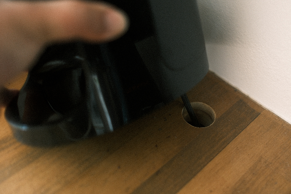 しかし少しズラすと作業台天板に穴が空いていて謎のホースがその下へと伸びていっています。