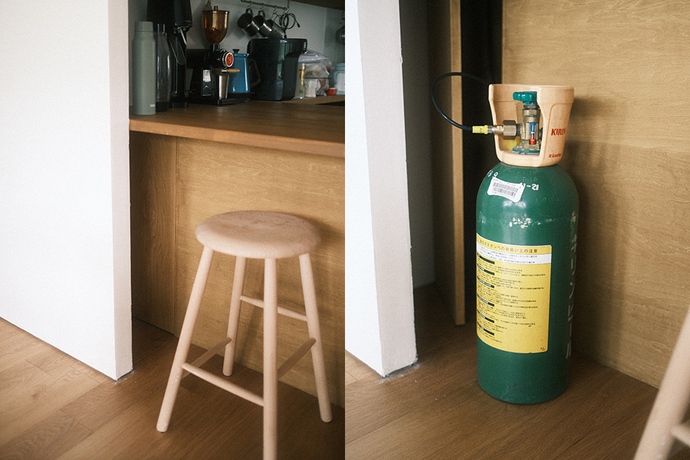 その奥に収められているのが通称“ミドボン”こと業務用炭酸ガスボンベです。