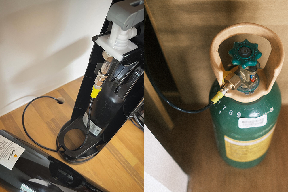 こいつを炭酸水メーカーに直結し、純正のガスシリンダーとは比べ物にならない、圧倒的なコスパを実現しているというワケです。
