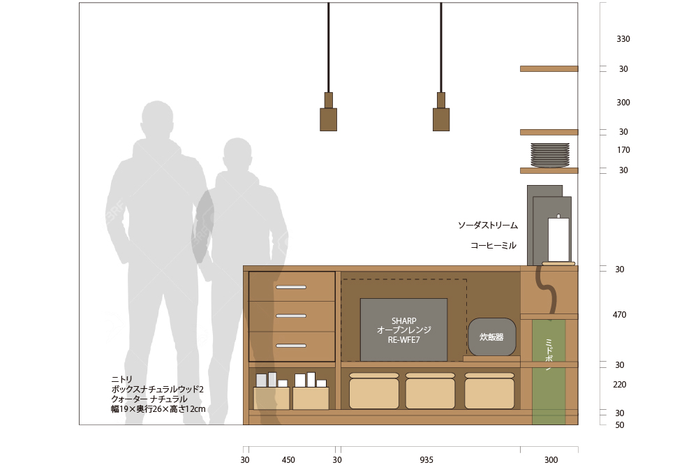 図の右側が西面の壁なんですが、ちょうどミドボンがある腰下あたりの棚をダボで高さ調整できるようにする都合上、どうしても炊飯器の横あたりにデッドスペースができます。