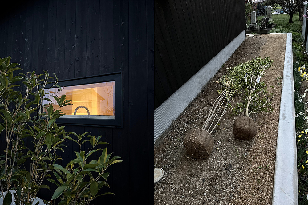 庭木もそうとう長くお付き合いしていくものなので、結構ドキドキしながら最初の一本を購入しました。でもさすがに最初の一本を表の庭の真ん中に植える勇気は無かったので、最初の一本は裏に植える用のギンモクセイ(右)になりました。※左に転がっているのはシマトネリコ