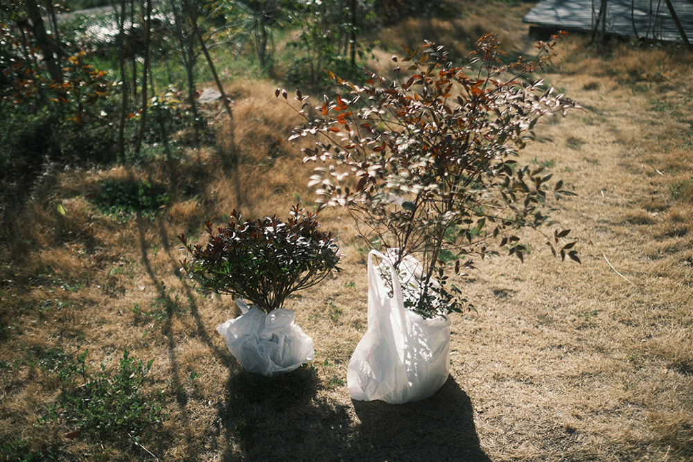 今回植えた木は樹高が低いのでやってませんが、風の影響を受ける背の高い木は支柱も建てた方が良いかと思います。