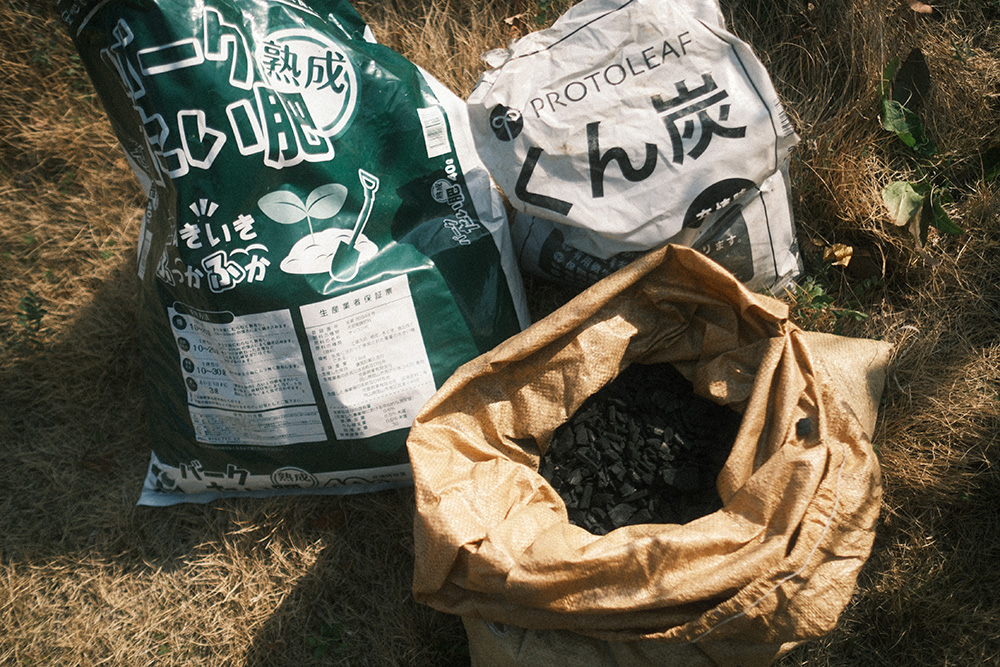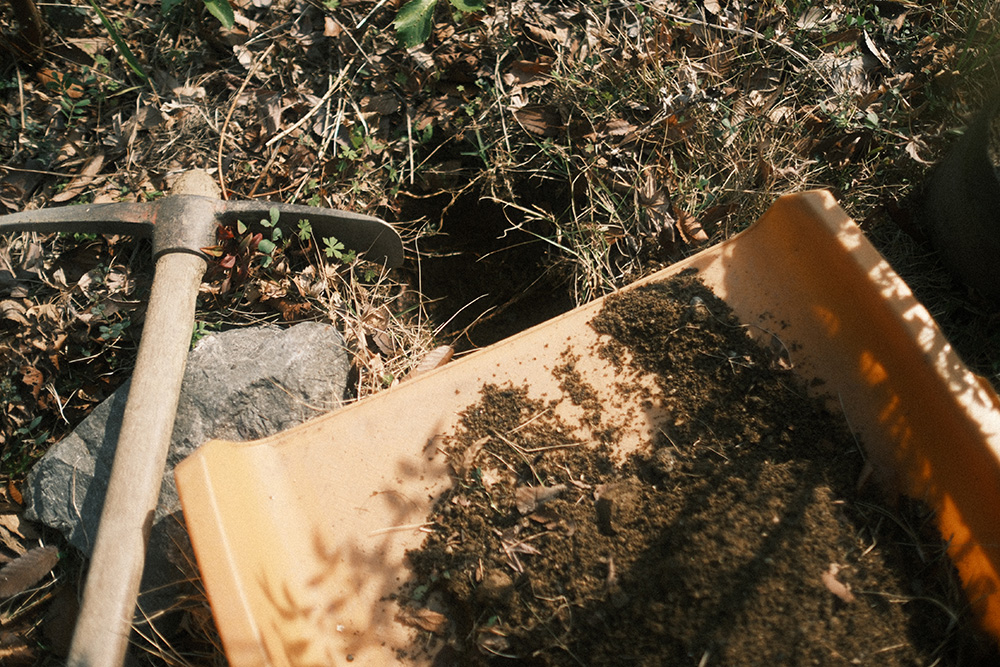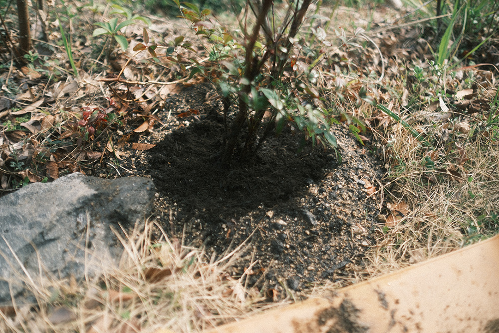 グリグリで開けた穴に色々突っ込んで、より植物が根付きやすくなるよう土壌を改良していきます。