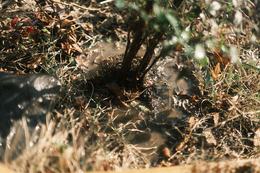 穴と根鉢の間の隙間に少量ずつ土を戻しながらホースなどで掘った穴がヒタヒタになるくらい水をたっぷりと流し込みます。土を戻す時にさっきのグリグリ棒などでグサグサやりながら水と土を入れると良いでしょう。