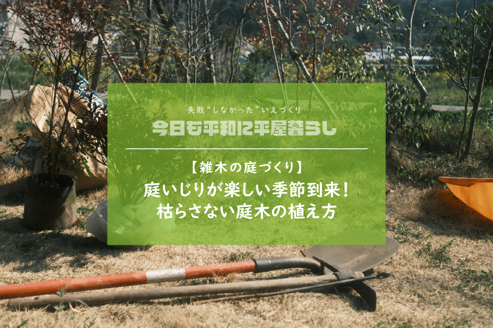 今回植えた木は樹高が低いのでやってませんが、風の影響を受ける背の高い木は支柱も建てた方が良いかと思います。