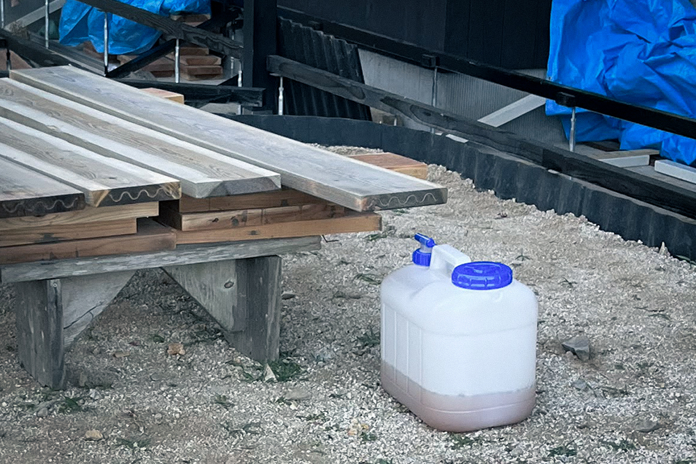 ウッドロングエコの粉が入っているので、それ専用に用意したポリタンクに