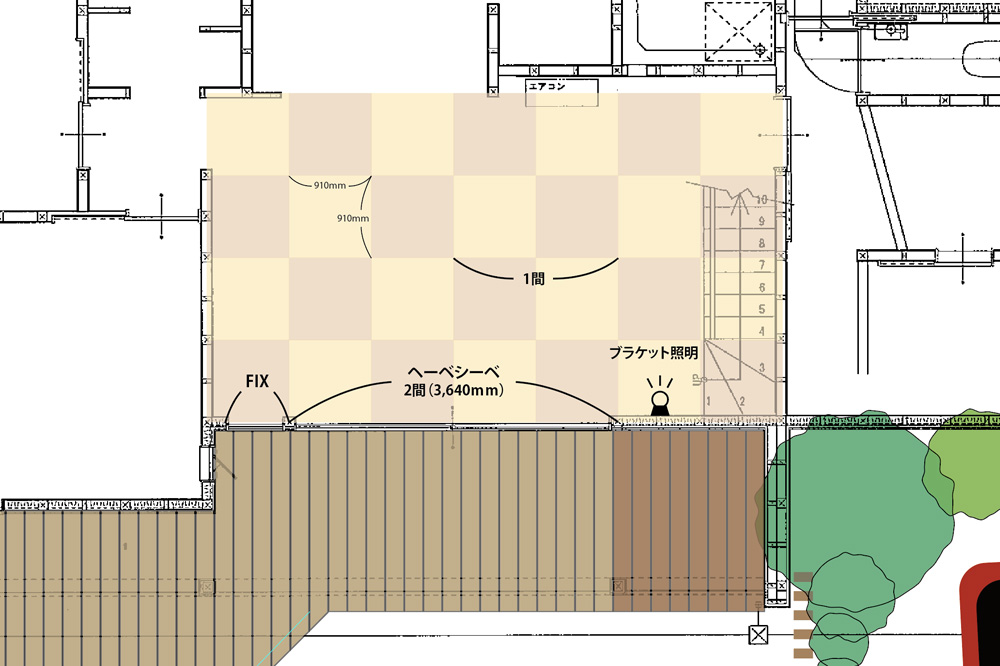 建物を設計する際、柱と柱の間隔は910mm(半間)が基本となります。下の図ではベージュの四角1つが910mm角で、四角2つで1間、4つで2間となります。このベージュの市松模様の上に壁を作っていき、必要に応じて柱を1間飛ばしたりなんかしながら設計(のベース)を作るんですね。