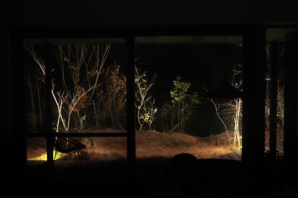 季節ごとに表情を変える庭の木々や、遠くの山々、空、雲・・・。それらを眺めるのも最高ですが、実は夜も結構良いんです。ロールスクリーンを上げ、室内の明かりを落とせばライトアップされた庭が浮かび上がって昼間とはまた違う雰囲気に。